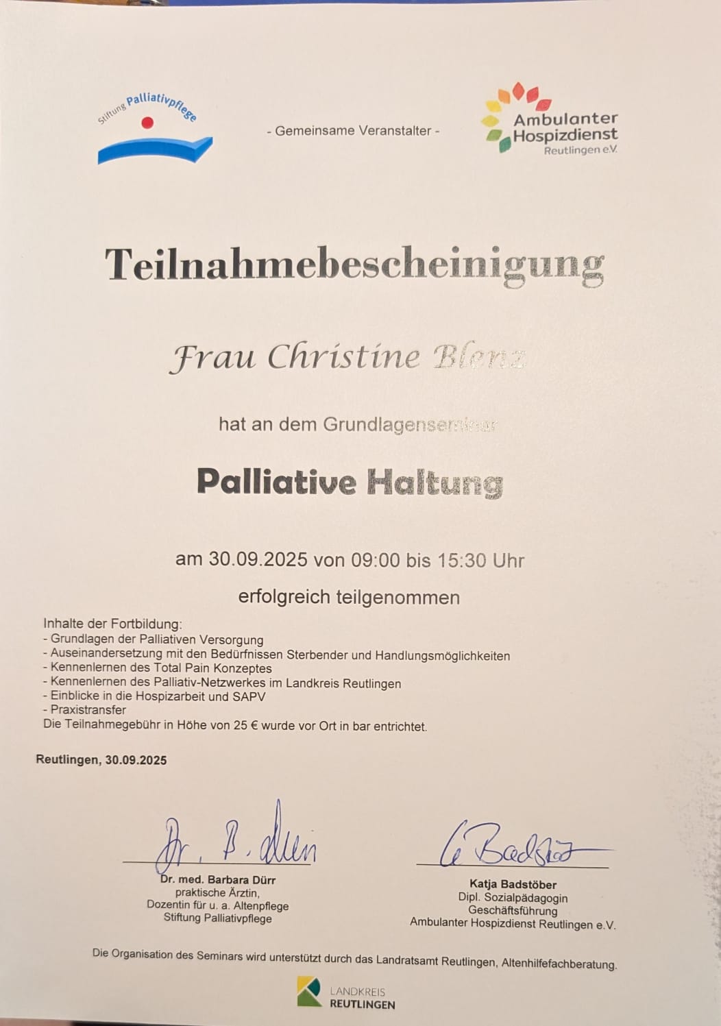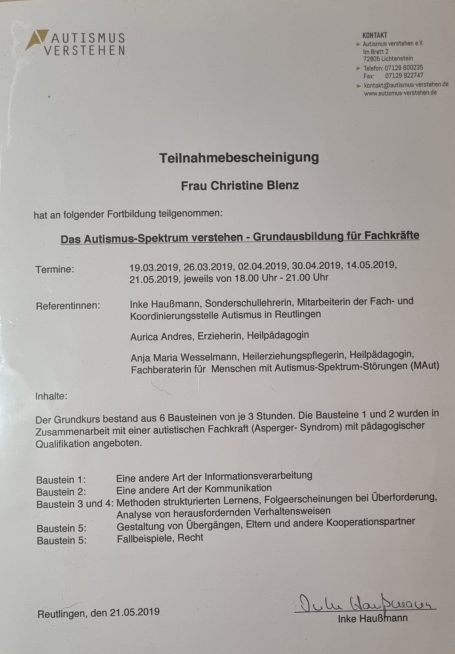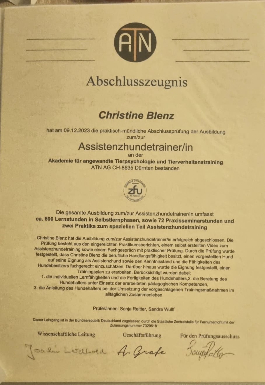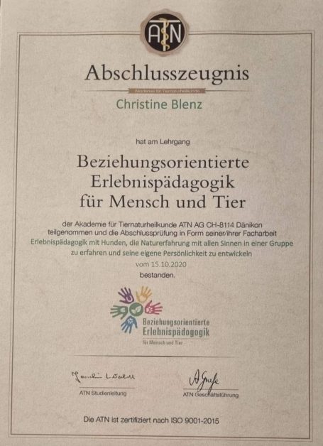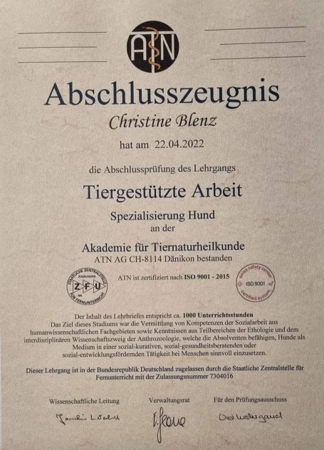 Bei der ATN Akademie für Tierpsychologie und Tierverhaltenstraining in der Schweiz absolvierte ich ein 2 Jähriges Studium in Tiergestützter Arbeit, sowie Erlebnispädagogik mit Tieren mit anschließendem Abschlusszeugnis. Des Weiteren absolvierte ich den Assistenzhundetrainer mit Abschlusszeugnis und den Therapiehundetrainer.